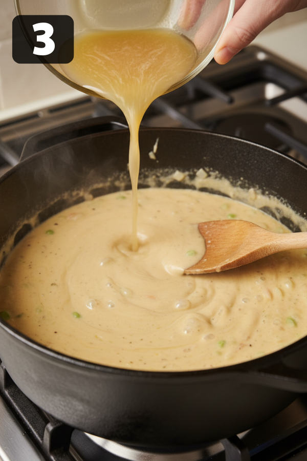 Slowly pour in chicken broth while stirring. The mixture will thicken quickly—keep stirring to avoid lumps.