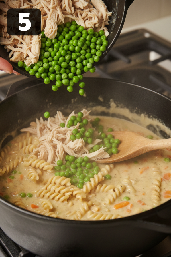 Add shredded chicken and frozen peas. Cook for another 3–5 minutes until heated through.