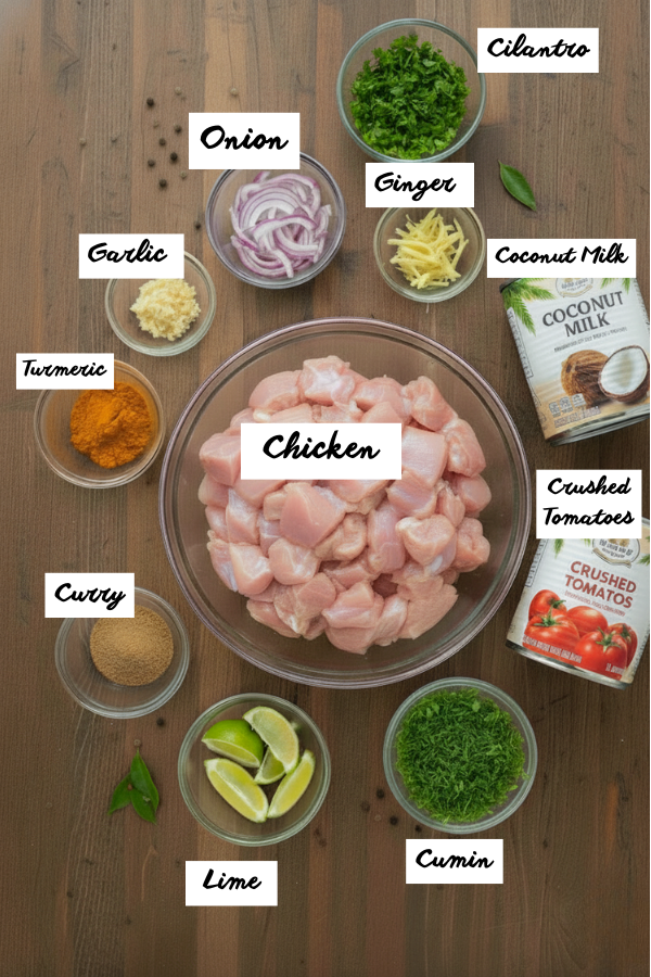 - Chicken: onion, garlic, ginger, curry powder, turmeric, cumin, tomato paste, crushed tomatoes, coconut milk, broth, sugar, salt, optional veggies, cilantro, lime.