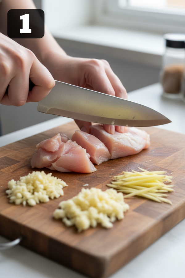 - Step 1 – Prep Like a Pro (5–10 Minutes) Cut chicken into even, bite-size pieces so they cook at the same rate. Chop onion, mince garlic, and grate ginger. Measure spices into a small bowl so they’re ready to go. Shake the can of coconut milk to mix the thick cream and thinner liquid.