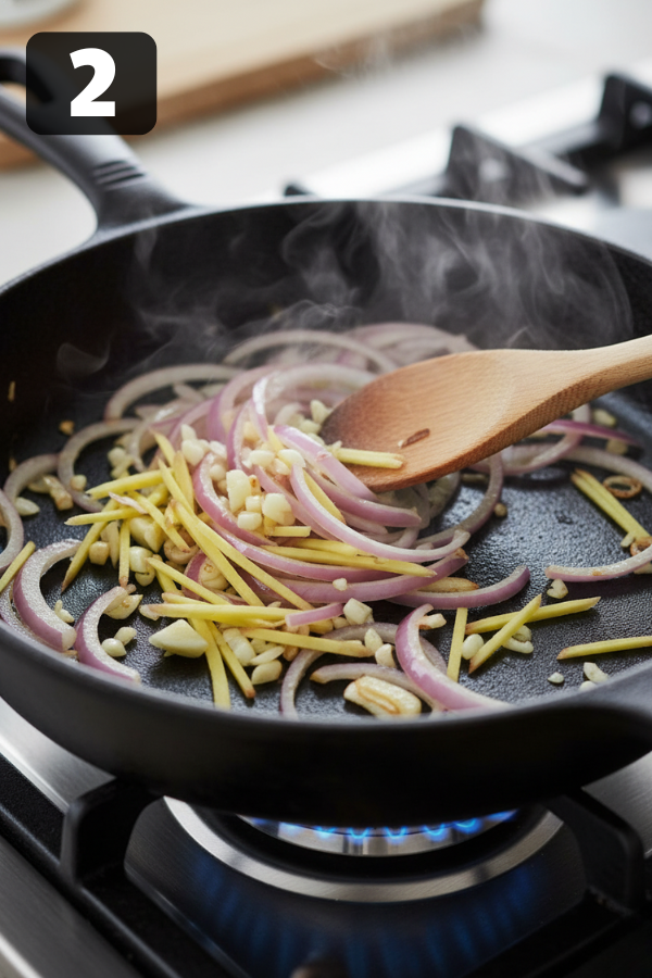 - Step 2 – Sauté Aromatics Until Your Kitchen Smells Amazing Heat 2 tablespoons oil in a large, wide pan over medium heat. Add chopped onion. Cook 3–5 minutes until soft and just starting to turn golden at the edges. Stir in garlic and ginger. Cook about 1 minute, stirring, until fragrant but not browned. Tiny tip: if the mixture starts to stick, add a splash of water instead of extra oil.