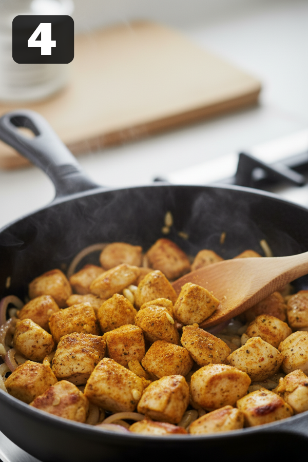 - Step 4 – Brown the Chicken Gently Add the chicken pieces to the pan. Toss to coat in the spice-onion mixture. Cook 3–4 minutes, stirring occasionally, until the outside is opaque and lightly browned. You’re just searing the outside now; the chicken will finish cooking in the sauce.