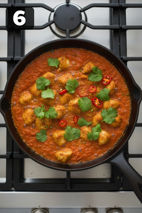 - Step 6 – Simmer Gently Until Tender Lower the heat to medium-low so the curry is bubbling gently, not boiling hard. Simmer, uncovered, for 10–12 minutes: Chicken should be cooked through (no pink inside). Sauce should be thicker, glossy, and nicely clingy. In the last 2–3 minutes, stir in quick-cooking veggies like spinach or peas so they stay bright and fresh. If the sauce gets too thick, add a splash of water or broth. If it’s too thin, simmer a few extra minutes.