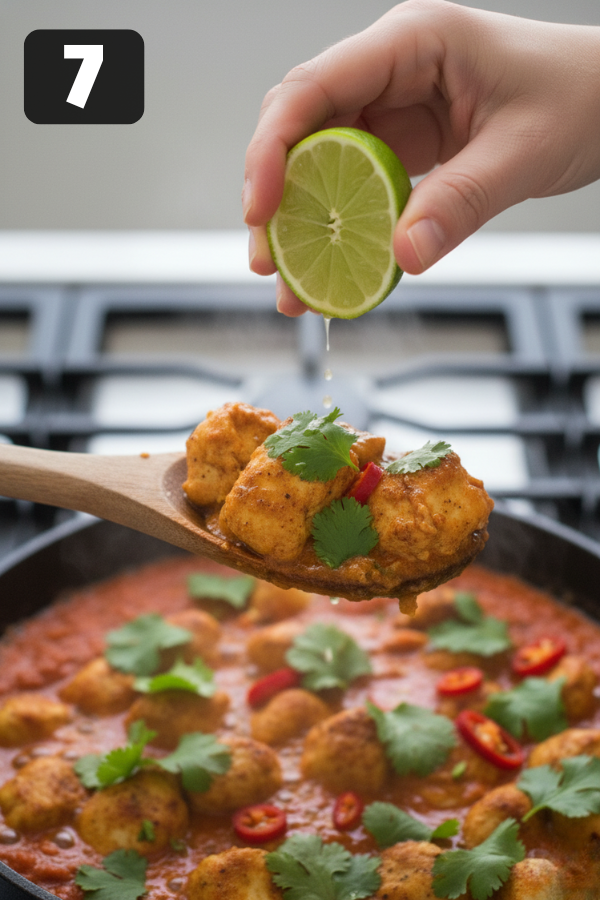 - Step 7 – Taste, Adjust, and Finish Taste the sauce and adjust: Salt — if it tastes flat, it probably needs a tiny bit more. Sugar — a pinch can smooth out acidity. Heat — add a small pinch of cayenne if you want more kick. Stir in chopped cilantro if you like that fresh, herbal flavor. Squeeze over some lime juice right before serving for brightness. Serve hot over rice, with naan on the side, and whatever toppings your family loves.