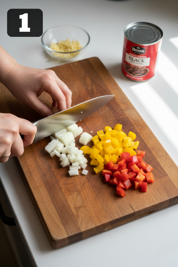 - Prep the Good Stuff Get everything ready so your morning isn’t chaos. Dice the onion and bell pepper. Mince the garlic. Drain and rinse the black beans. Drain the corn (if using canned). Trim any big bits of fat from the chicken. If you’re prepping the night before, you can store all the chopped veggies and canned ingredients together in a big container in the fridge. Then in the morning, you just pour everything in.