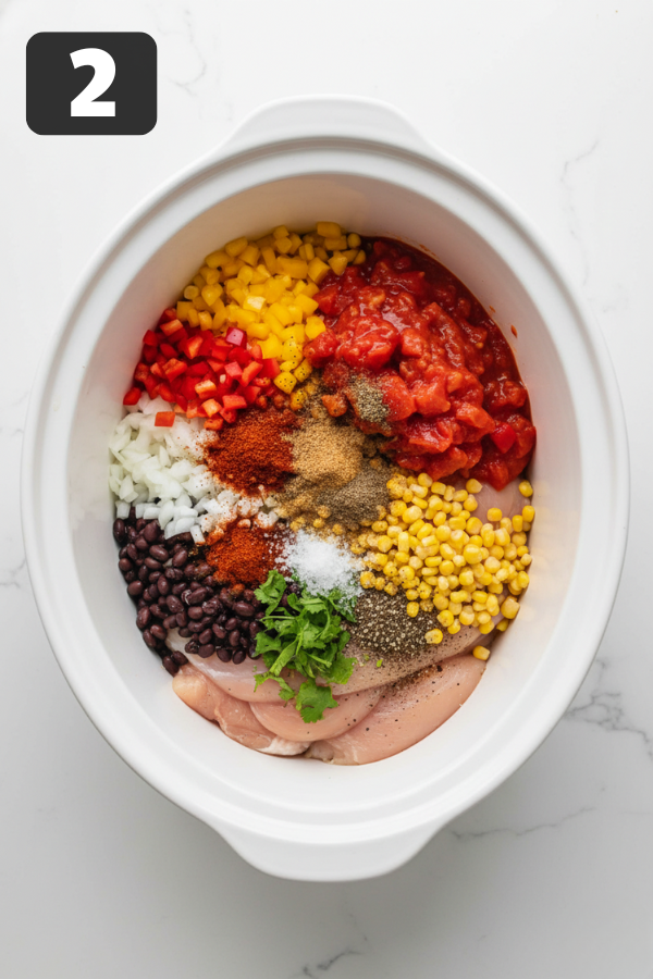 - Build the Crock Pot Base Now the fun “dump it in” part. Place the chicken breasts (or thighs) in a 5–6 quart crock pot. Add onion, bell pepper, garlic, black beans, corn, diced tomatoes with chilies, and enchilada sauce on top. Pour in the chicken broth. Sprinkle taco seasoning, chili powder, cumin, smoked paprika, salt, and pepper over everything. Give it a gentle stir, just enough to mix the seasonings into the liquid. If you like extra flavor, you can quickly sauté the onion, peppers, and garlic in a pan with a spoonful of oil first until they’re soft and sweet. But if you’re racing out the door? Skip that. The crock pot has your back.