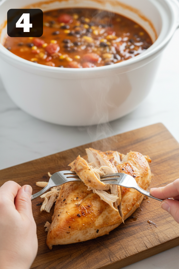- Shred the Chicken When the chicken is fall-apart tender, it’s time for the most satisfying part. Use tongs to lift the chicken out onto a cutting board. Shred it with two forks into bite-size pieces. Return the shredded chicken to the crock pot and stir. Taste the broth now. This is your chance to adjust: Add more salt if it tastes a bit flat. Add a pinch more chili powder or cumin if you want more warmth. Stir in the juice of 1–2 limes for brightness. Honestly, that lime juice at the end makes a bigger difference than you might expect. It wakes the whole pot up.