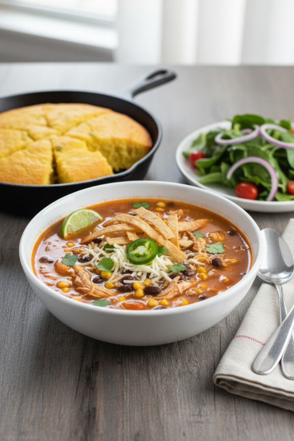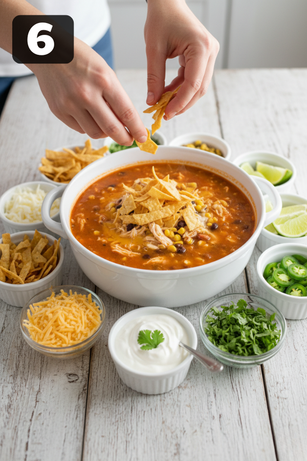 - Serve with All the Toppings Ladle the soup into bowls and set out a simple topping bar: Tortilla strips or crushed tortilla chips Cheese Sour cream Avocado Cilantro Jalapeños Lime wedges Kids can build their bowls like mini taco projects. Adults can make theirs lighter or richer. One pot, lots of options.