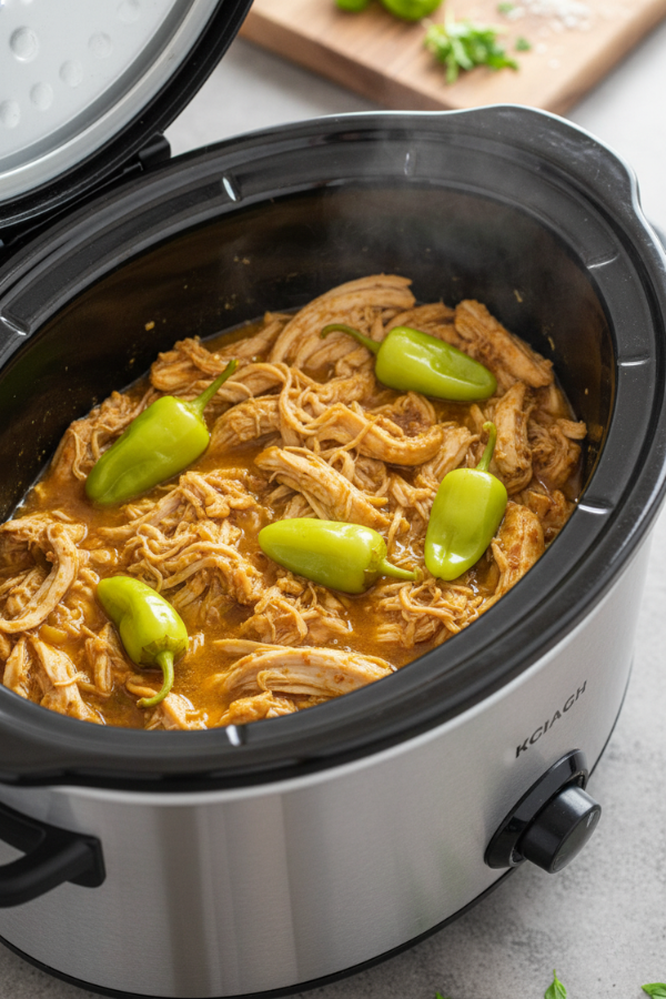 - Add Pepperoncini Scatter the whole peppers around the chicken. Pour in a little of the juice if you like extra tang.