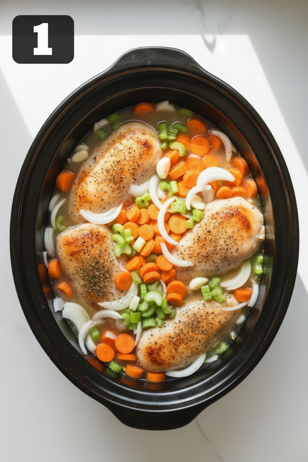 - Load the crockpot Add chicken, chopped carrots, onion, celery, garlic, Italian seasoning, and broth. A common starting point: 3 chicken breasts 2 cups sliced carrots 1 cup onion 2 stalks celery 3 cloves garlic 4 cups broth Slow cook: Cook on low for 6 hours or high for 4 hours, until the chicken falls apart easily.