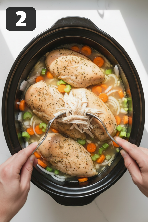 - Shred the chicken You can shred it right in the pot using two forks. Stir it into the broth so it absorbs all that flavor.
