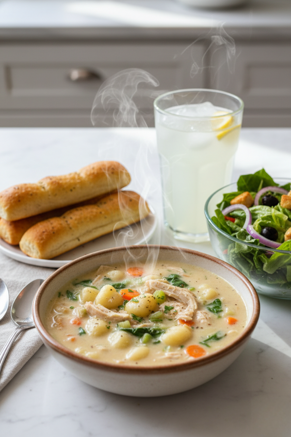 - Garlic bread or warm breadsticks — perfect for soaking up the creamy broth