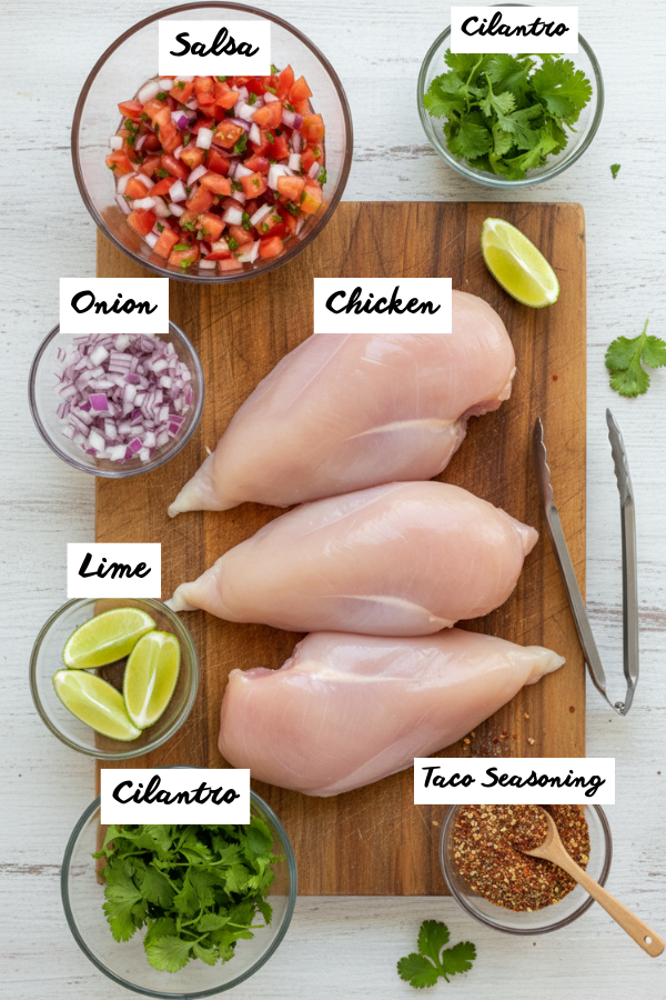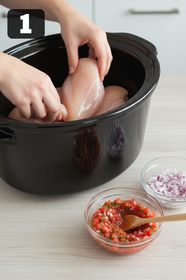 - Load The Slow Cooker Lightly grease the slow cooker insert (optional, but it helps with sticking). Add diced onion (if using). Place the chicken on top. Pour salsa over the chicken. Add drained diced tomatoes with green chiles (if using). Sprinkle taco seasoning over everything. Tiny tip that matters: Try to coat the chicken with the seasoning. You don’t need to be perfect—just give it a quick stir around the chicken so flavor starts evenly.