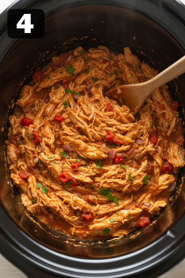 - Stir It Back Into The Juices Return shredded chicken to the slow cooker. Stir well so the chicken absorbs the flavorful liquid. This is the part that makes it taste “finished.” Shredding is good. Shredding and stirring it back into the sauce is better.