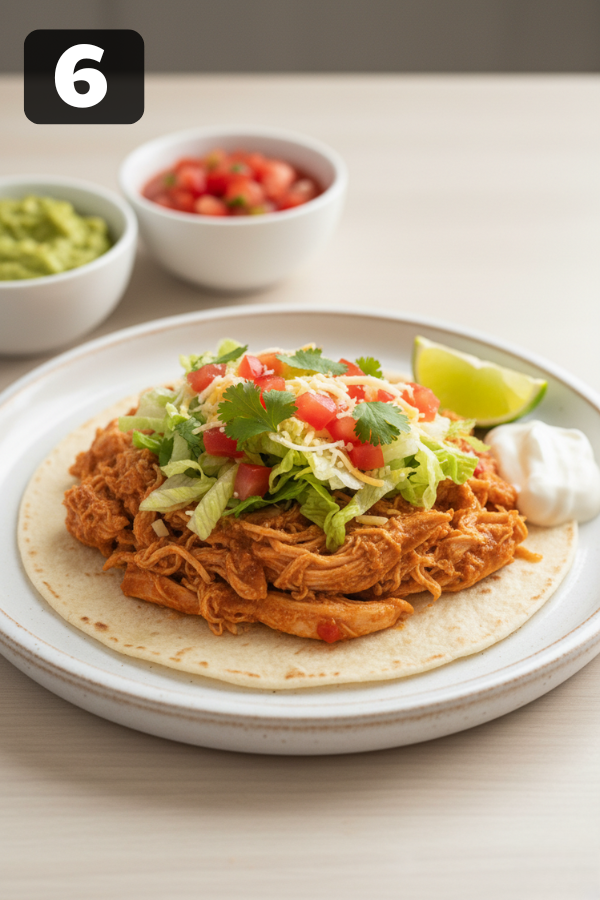 - Serve Warm tortillas (quick pan warm-up or microwave wrapped in a damp towel). Fill with shredded chicken. Add toppings and eat immediately—because taco night waits for no one.