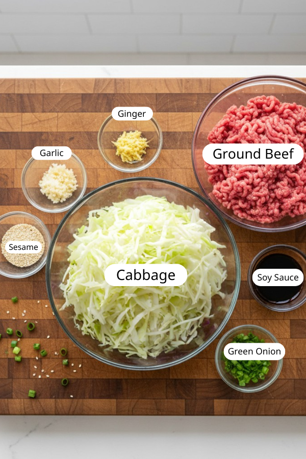 1. Step 1: Prep Your Ingredients A few minutes of prep makes the whole recipe smoother. Shred the cabbage: cut the head in half, remove the core, and slice into thin ribbons (⅛–¼ inch wide). The thinner the slices, the faster and more evenly they cook. Mince the garlic into tiny pieces so they fry quickly without burning. Grate the ginger using a microplane or the smallest holes of a box grater. Optional veggies: julienne the carrots or slice mushrooms/bell peppers if you’re including them. Measure your sauce ingredients ahead of time in a small bowl — soy sauce, vinegar, sugar, sriracha, water. This helps you avoid scrambling while the beef cooks. Pro tip: Keep the chopped aromatics and veggies in separate bowls. You’ll add them in stages and don’t want to guess what’s next.