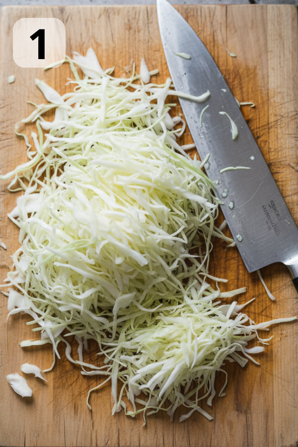 • Shred the cabbage: cut the head in half, remove the core, and slice into thin ribbons (⅛–¼ inch wide).