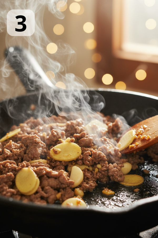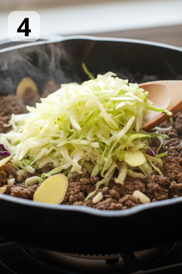 2. Step 2: Brown the Beef This is where the flavor builds. Heat a large skillet or wok over medium-high heat. The pan should feel hot enough that the beef sizzles on contact. Add 1 tablespoon neutral oil (canola, vegetable, avocado). Add the beef and immediately start breaking it up with a spatula. Aim for small crumbles — they mix better with the cabbage later. Season lightly with salt and pepper. Avoid too much salt now because soy sauce will add more later. Cook 5–7 minutes, stirring occasionally. Pro tip: Let the beef sit undisturbed for 30–40 seconds at a time. This helps browning instead of steaming.
