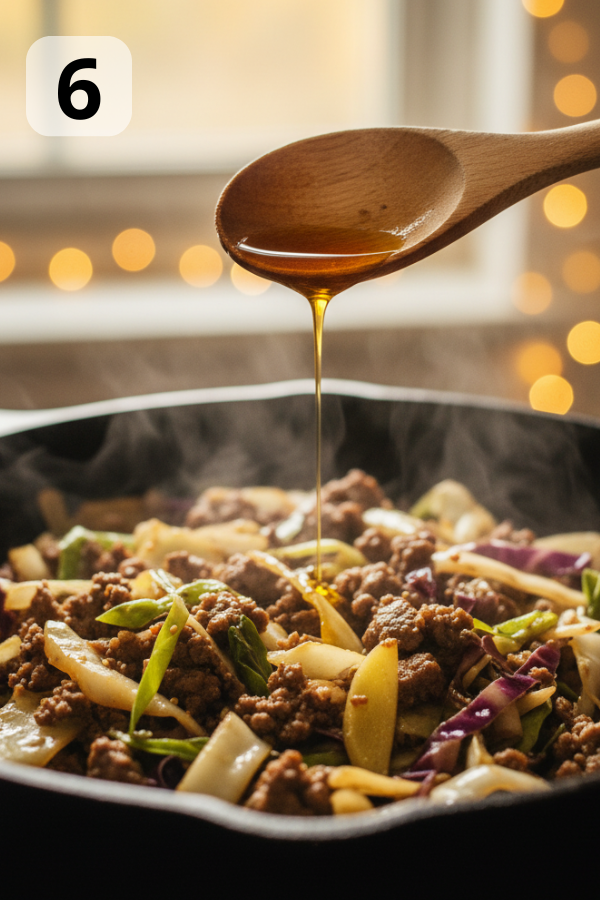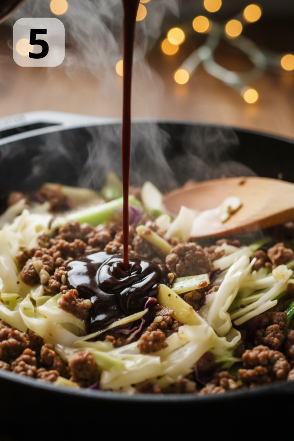 5. Step 5: Add the Sauce This is where the magic happens — small ingredients becoming one big flavor. Pour in the mixed sauce: soy sauce + rice vinegar + brown sugar + water + sriracha (if using). Stir everything so the beef and cabbage are coated. Let the mixture simmer 1–2 minutes If the pan looks too watery, increase heat for 30–60 seconds to reduce moisture. Flavor tip: Add an extra teaspoon of soy sauce or vinegar after tasting if you want more punch.
