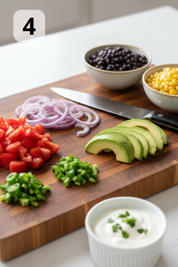 - Step 4 – Prep the Toppings & Sauce While the chicken cooks or rests, use that time: Slice the avocado, halve the tomatoes, and slice the red onion. Rinse and drain the black beans. Warm the corn briefly in a small pan if you like it hot, or leave it cool and crisp. Whisk together the sauce ingredients in a small bowl until smooth and spoonable. This is the “assembly line” part. It looks like more work written out than it feels in real life.