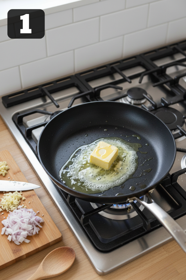 2. Sauté The Aromatics Once the butter is melted: Add the chopped onion/shallot (if using) and cook for 2–3 minutes until it softens and turns translucent. Stir in the minced garlic and cook for another 30–60 seconds, just until fragrant. If the garlic starts to brown, lower the heat; burnt garlic tastes bitter fast.