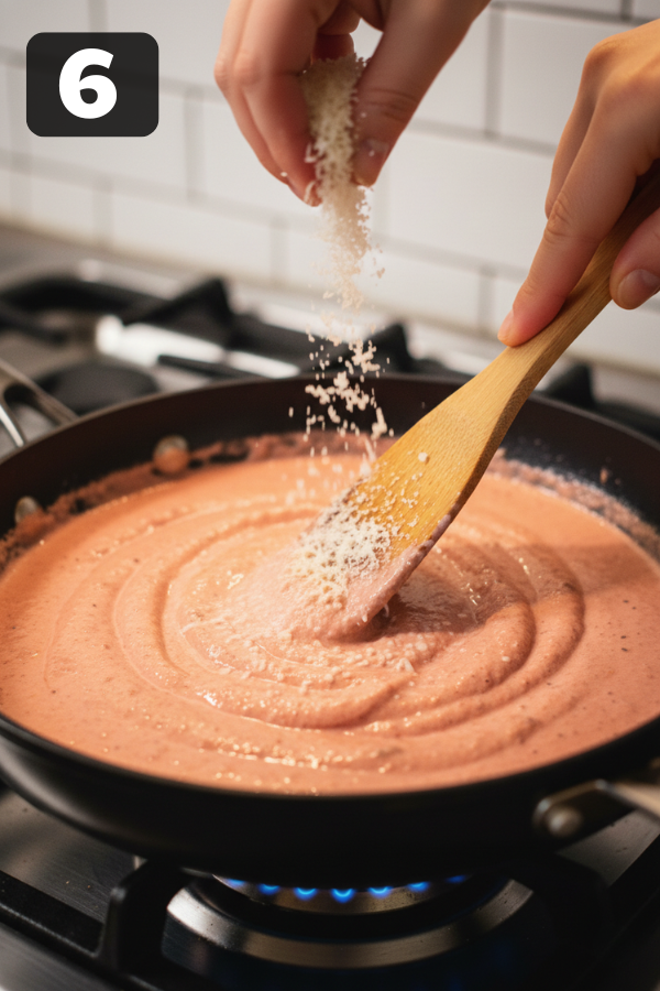 5. Pour In The Cream And Let It Turn Silky Now we soften everything. Turn the heat down to low. Slowly pour in the heavy cream while stirring. Keep stirring until the sauce looks smooth and turns a beautiful blush-pink color. Let it gently bubble (not hard boil) for 5–8 minutes, stirring now and then, until it thickens enough to coat the back of a spoon.