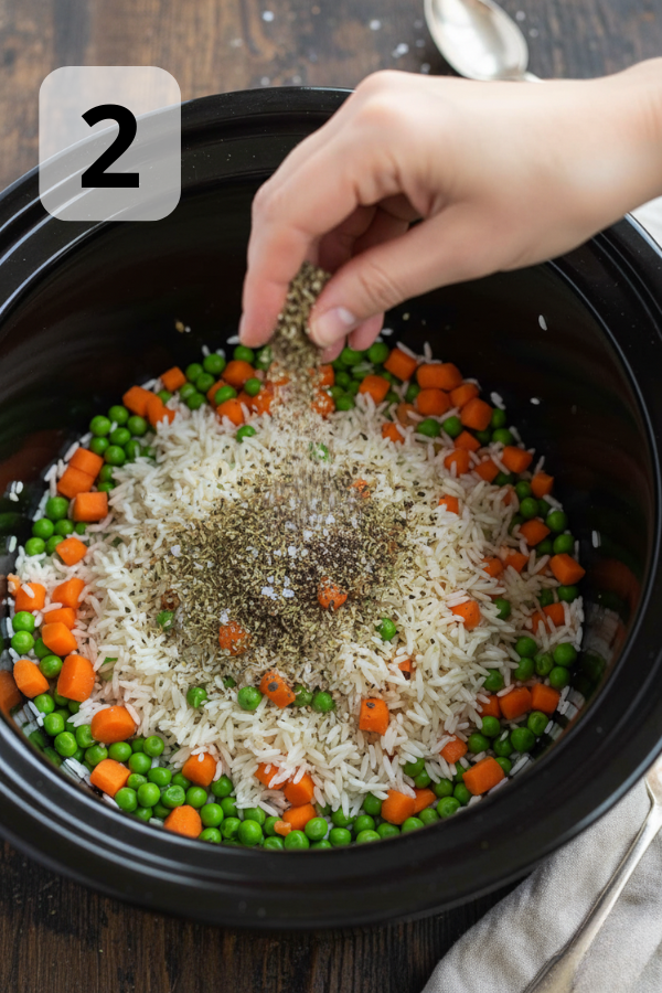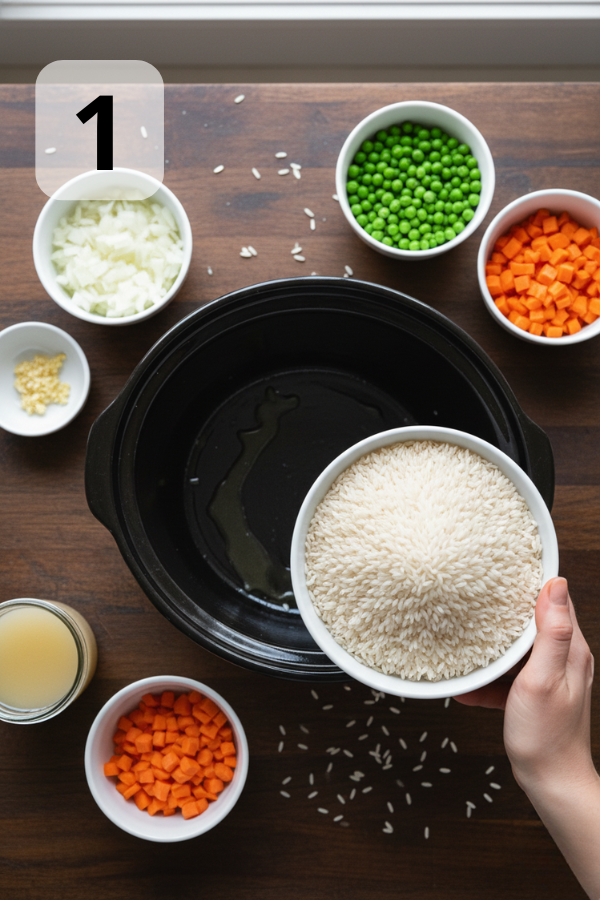 - Step 1: Prep the Crock Pot Base Lightly grease the slow cooker insert with a bit of butter or oil. Add the rinsed rice, chopped onion, garlic, carrots, and frozen peas/mixed vegetables. Pour in the chicken broth and stir to combine. Mini tip: Rinsing the rice removes extra starch and helps prevent it from becoming gummy.