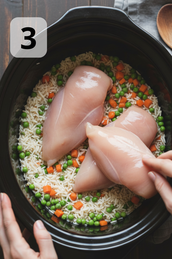 - Step 3: Add the Chicken Lay the chicken breasts or thighs in a single layer on top of the rice mixture. Sprinkle a small pinch of salt and pepper directly on the chicken. Mini tip: Don’t cut the chicken yet; it stays juicier if you shred it after cooking.