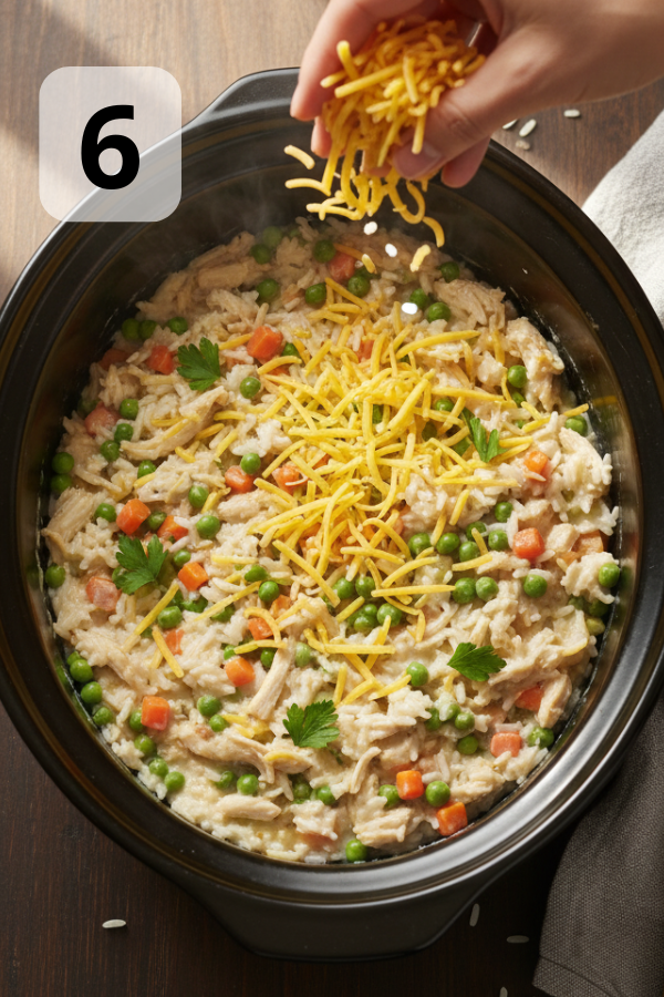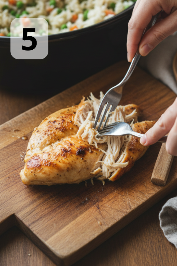 - Step 5: Shred the Chicken and Stir Everything Together Once cooked, remove the chicken to a plate and gently shred it with two forks. Return the shredded chicken to the crock pot and stir well to mix with the rice and veggies. If the mixture looks a bit dry, add a splash of broth or milk to loosen it.