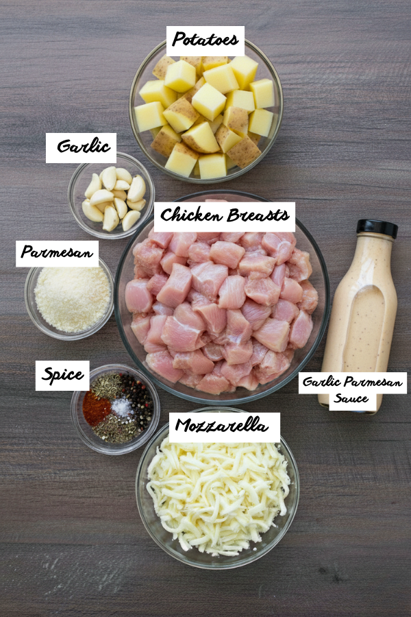 Chicken, potatoes, garlic Parmesan sauce from a bottle (or homemade), cheese, simple pantry spices. Stuff you can actually find at Walmart or Kroger.