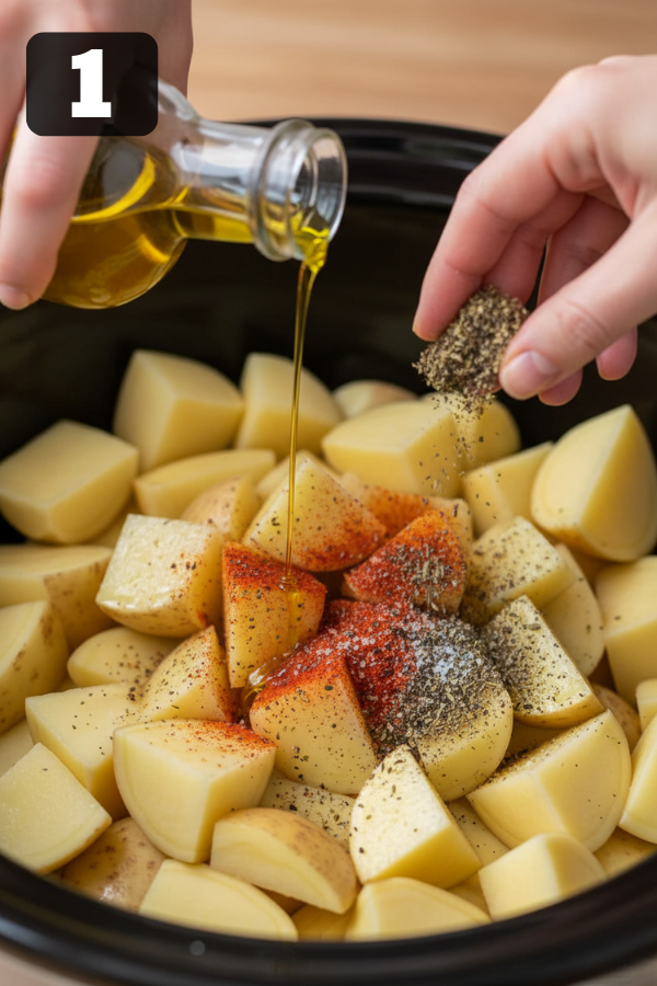 1. Step 1 – Season the Potatoes Place the chopped potatoes in the bottom of your greased slow cooker. Drizzle with olive oil. Sprinkle on salt, pepper, paprika, garlic powder, onion powder, and a pinch of Italian seasoning. Toss right in the crock until the potatoes are coated and spread them in an even layer. Why this step matters: potatoes take longer than chicken to cook, so they need direct contact with the heat.