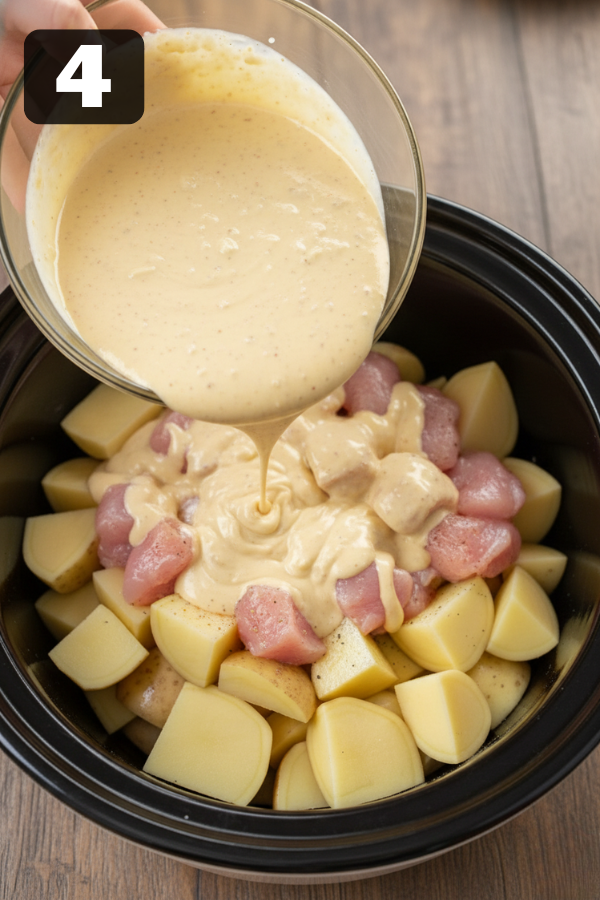 4. Step 4 – Pour and Cover Pour the sauce evenly over the chicken and potatoes. Use a spatula or spoon to gently nudge the sauce around so most of the potatoes and chicken get some coverage. No need to stir like crazy; just make sure you don’t have dry pockets. Pop the lid on the slow cooker.
