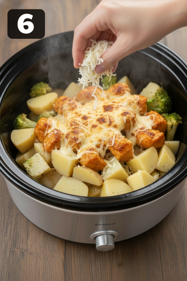 6. Step 6 – Add Veggies and Cheese About 20–30 minutes before serving, stir in your broccoli (or other quick-cooking veggies) on top. Put the lid back on so they steam until tender-crisp. Then, 5–10 minutes before serving, sprinkle mozzarella over the top. Cover again and let it melt into a gooey blanket. If your slow cooker has a WARM setting, you can flip to that once the cheese starts to melt.