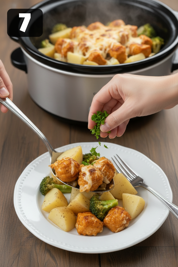 7. Step 7 – Taste, Garnish, and Serve When the cheese is melted and the potatoes are tender, turn off the slow cooker. Give the sauce a gentle stir near the edges and taste a spoonful. Adjust with a pinch of salt, pepper, or extra Parmesan if needed. Spoon into bowls or plates, making sure everyone gets chicken, potatoes, sauce, and veggies. Finish with fresh parsley on top. Is it fancy? Not really. Is it satisfying on a cold night when you’re tired and hungry? Absolutely.