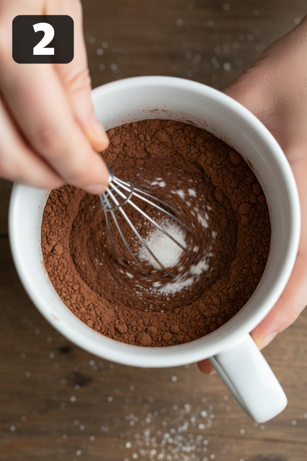 2. Whisk The Dry Ingredients Right In The Mug Add your flour, cocoa, sugar, baking powder, and a pinch of salt directly into the mug. Use a fork or mini whisk to stir everything until the color looks even. This prevents dry pockets of flour hiding at the bottom. Honestly, this 10-second whisking step makes the difference between “Oh wow” and “Why is there raw flour in my last bite?”