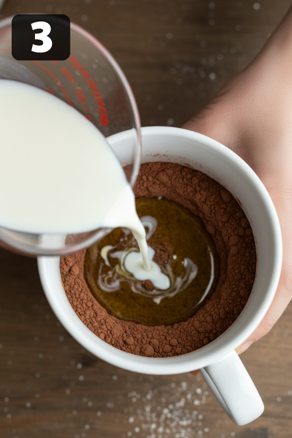 3. Add The Wet Ingredients And Mix Until Smooth Pour in the milk, oil or melted butter, and vanilla. Stir from the bottom of the mug up, scraping the sides as you go. The batter should look smooth and slightly thick—like a loose brownie batter. If it feels too thick, you can add a tiny splash of milk (about ½ teaspoon) to loosen it. Try not to beat it like pancake batter. Just mix until you don’t see dry spots anymore.