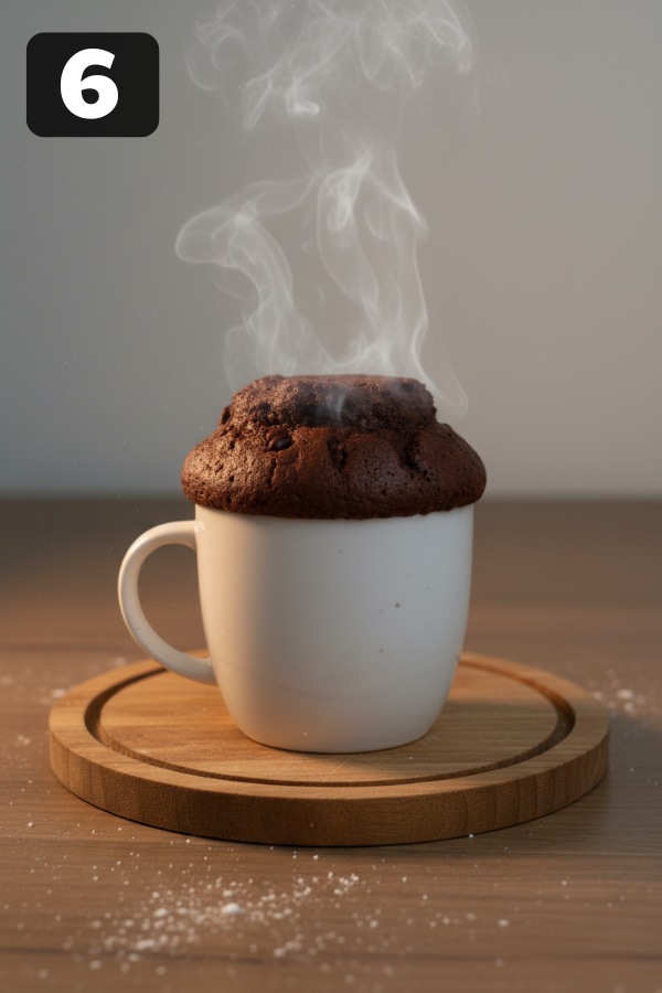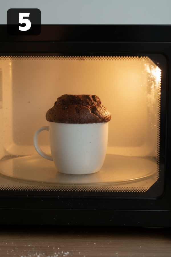 5. Microwave For About 1 Minute Place the mug in the center of the microwave. In a typical 1000W microwave, start with 45–60 seconds on high. If your microwave is very powerful, you may need closer to 45 seconds. If it’s older or lower wattage, you might need closer to 60–75 seconds, but always check early. The cake should rise, set on top, and look slightly glossy in the middle. If it still looks very wet, microwave in 10-second bursts until it’s just done. A tiny bit underdone is better than overdone. You can always add a few more seconds. You can’t un-cook a rubbery cake.