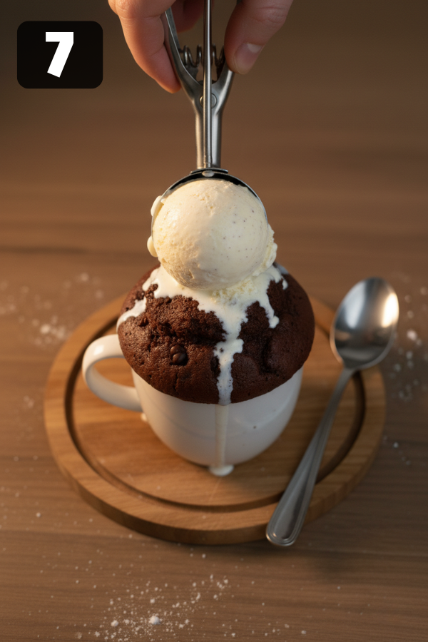 7. Top And Serve Warm Now the fun part: Add a scoop of vanilla ice cream, a swirl of whipped cream, or some berries. Eat it straight from the mug with a spoon. No need to unmold it; this is a “lazy but smart” dessert. If you’re serving someone else, you can wipe the rim of the mug and sprinkle a little cocoa or powdered sugar on top. It looks fancy even though it took you less than five minutes.