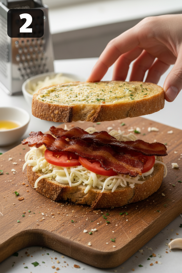 - Build the Sandwich Lay out your 4 slices of bread on a board. Spread a generous layer of garlic butter on one side of each slice. This will be the outside. Flip 2 slices so the buttered side is now touching the board. Divide your shredded cheese between those two slices (around ½ cup on each). If you’re using cream cheese or a soft spread, dot or spread 1–2 tablespoons on top of the shredded cheese. Add any extras now: a bit of bacon, one or two tomato slices, a few onions. Top each one with the remaining bread slices, buttered side facing out. You should now have two “garlic bread” sandwiches, ready to crisp.