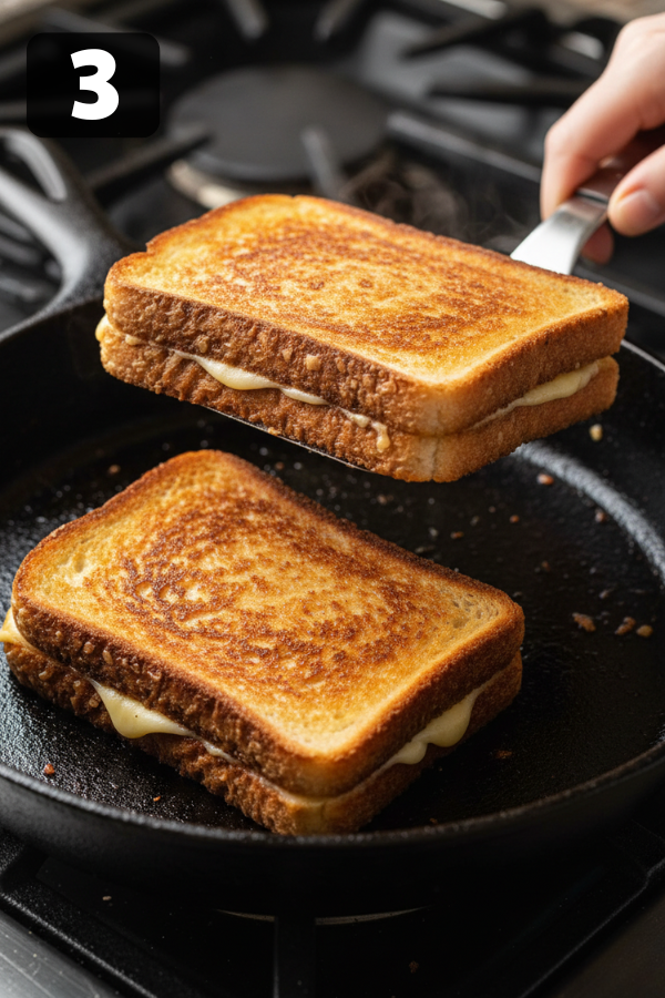 - Cook It in a Skillet (Classic Method) This is the version most people start with. Heat a nonstick or cast iron skillet over medium-low heat. When the pan feels warm (you can hover your hand a bit above it), place the sandwiches in. Cook the first side for about 4–5 minutes, until it’s golden and crisp. If it’s browning too fast, lower the heat. Flip the sandwiches carefully with a spatula. Cover the pan with a lid and cook another 4–5 minutes. The lid traps a bit of steam so the cheese melts all the way through. Check the bottom: it should be golden, not dark brown. When the cheese looks melty and just starting to ooze at the edges, take them out. Let the sandwiches sit on a cooling rack or a plate for a minute. That short rest stops the cheese from flooding out when you cut into it.