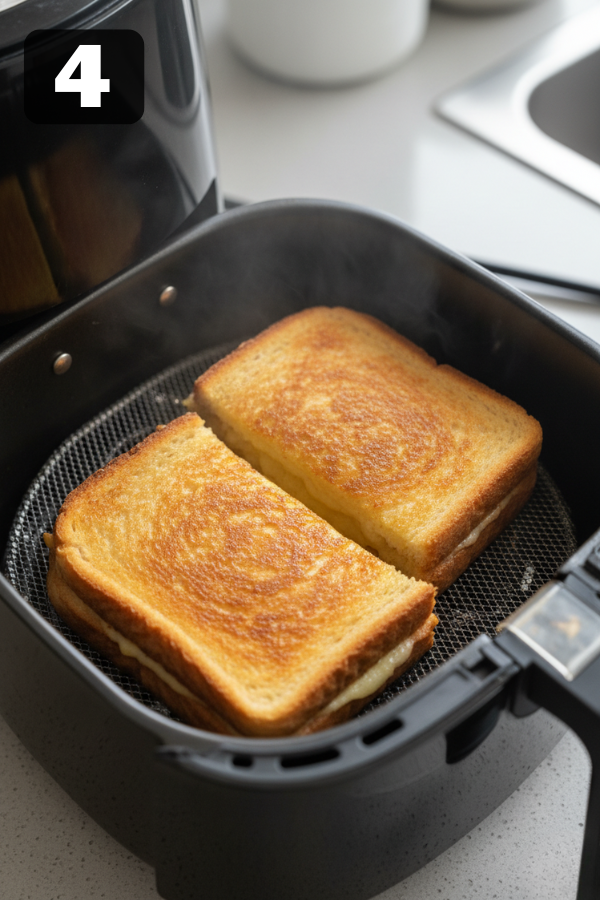 - Air Fryer Method (Hands-Off and Clean) If your air fryer lives on the counter, this is shockingly easy. Preheat the air fryer to 370–375°F (185–190°C) for a few minutes. Place the sandwiches in the basket in a single layer. Cook 3–4 minutes, then flip. Cook another 3–4 minutes, until the bread is crisp and the cheese has melted. If the top looks pale, add 1 extra minute. If it’s going dark too fast, lower the temperature next time. Cleanup is basically the basket and a knife. That’s it.