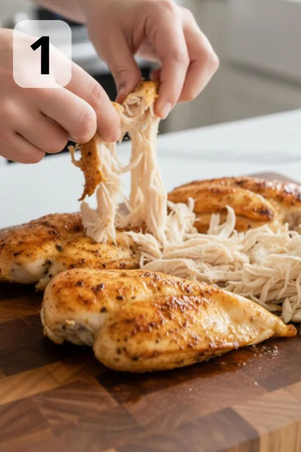- Step 1: Shred the Chicken: Rotisserie chicken makes this almost effortless — pull the meat off the bone while it’s still slightly warm, because it shreds more cleanly. If you’re cooking from scratch, simmer chicken breasts in lightly salted water for 12–14 minutes or bake them at 400°F for 15–18 minutes, depending on thickness. Let them cool just enough to handle, then shred with forks or a mixer. Tip: Leave a few larger chunks for a nice “bite” instead of shredding everything too fine.