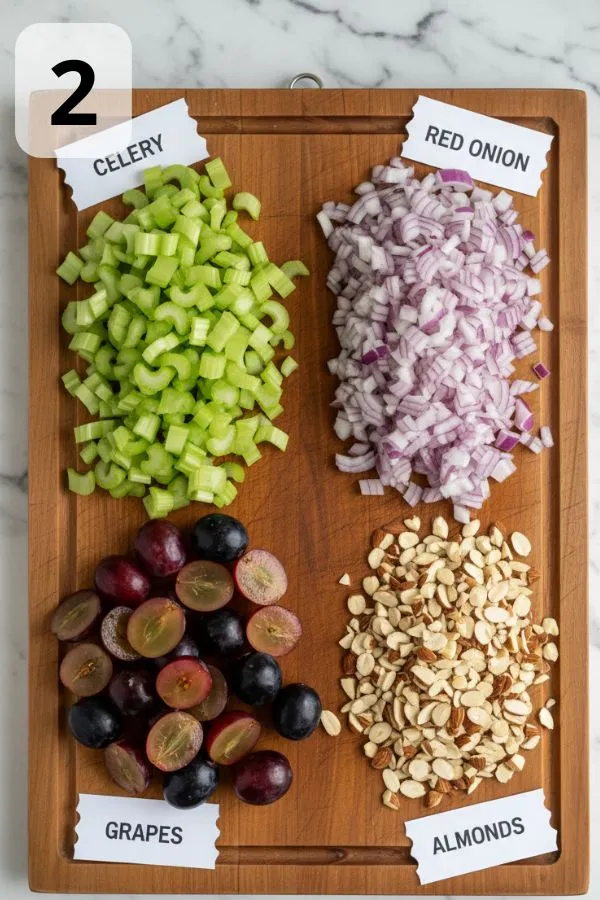 - Step 2: Chop the Veggies, Fruit & Nuts: Slice the celery thin for crispness, finely dice the red onion so it blends smoothly without overpowering, and halve the grapes (or chop apples) to add sweetness. Roughly chop almonds or pecans so they keep some texture. Take your time here — the mix of crunch, sweetness, and bite is what makes this salad feel bright and balanced. Tip: Pat grapes or apples dry after rinsing to keep excess moisture out of the salad.