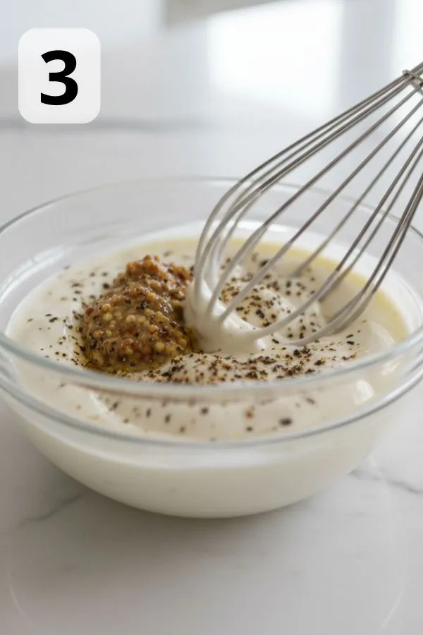 - Step 3: Make the Creamy Yogurt Dressing: In a medium bowl, whisk together Greek yogurt, Dijon, salt, pepper, and a small squeeze of lemon if you like a brighter flavor. The dressing should look thick, smooth, and glossy — not watery. If it feels thin, add a spoonful more yogurt or reduce the lemon. Optional boost: A pinch of garlic powder or fresh dill gives the dressing a cozy, homemade touch.