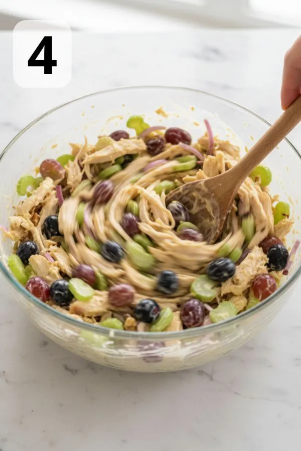 - Step 4: Fold Everything Together: Add shredded chicken, chopped veggies, nuts, and fruit into the bowl with the dressing. Use a spatula or wooden spoon to fold gently — mixing too aggressively breaks down the chicken and makes everything mushy. Taste the salad and adjust. A little extra salt, a small grind of pepper, or a squeeze of lemon often makes the flavors pop. Tip: If it looks a bit thick right after mixing, it usually loosens slightly as it chills.