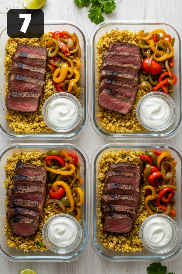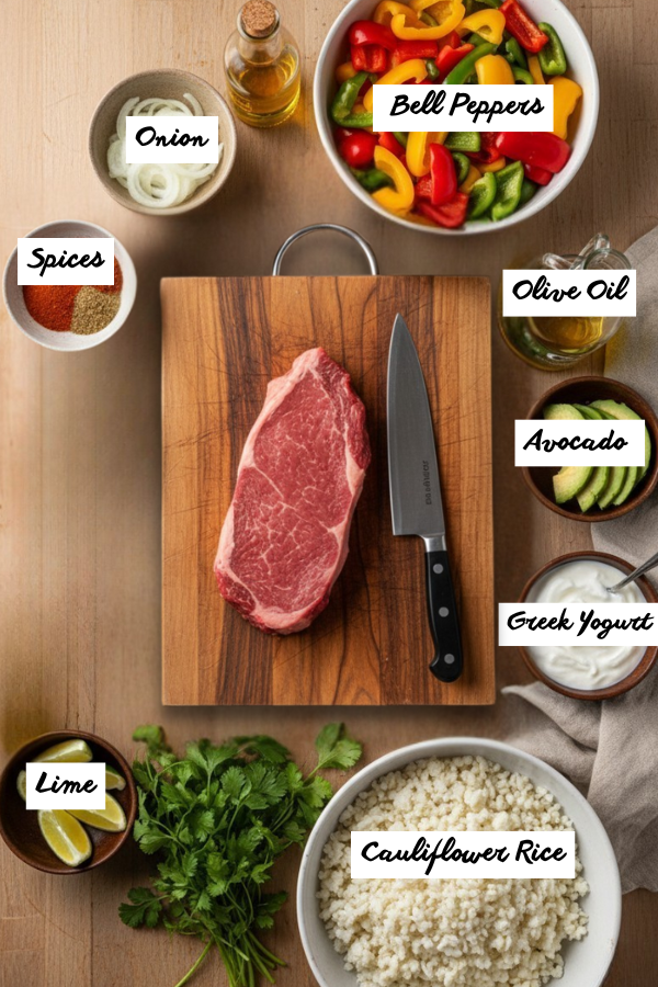 - Slice The Steak And Assemble Bowls Now the fun part. Slice the rested steak thinly against the grain. This single step is one of the big tenderness secrets. Fill each bowl with: 1–1½ cups cauliflower rice (or salad greens) A generous handful of peppers and onions 4–5 oz sliced steak Top with: A spoonful of Greek yogurt or sour cream Sliced avocado or a scoop of guacamole Salsa, cilantro, jalapeños, lime wedges It looks like something from your favorite burrito chain, only you know exactly what went into it.