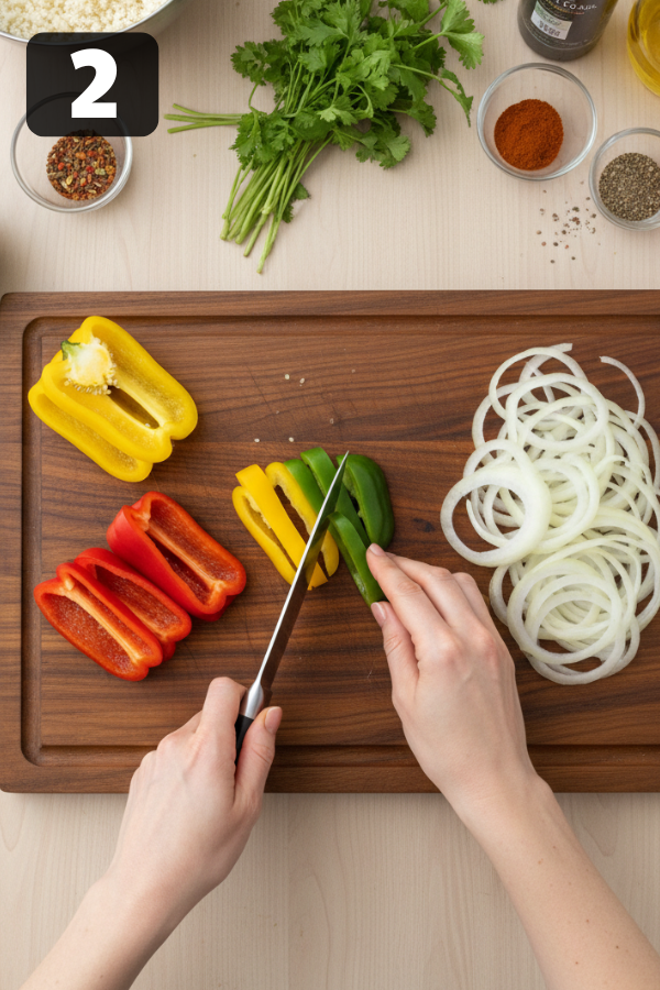 - Prep Veggies And Base While The Steak Rests You don’t need to stand around watching the fridge. Slice 2 bell peppers into strips. Slice 1 onion into thin half-moons. If using fresh cauliflower, grate or pulse florets in a food processor. If using frozen, just break up any big clumps. It’s simple knife work, and once you’ve done it once, you can do it almost on autopilot while listening to a podcast.