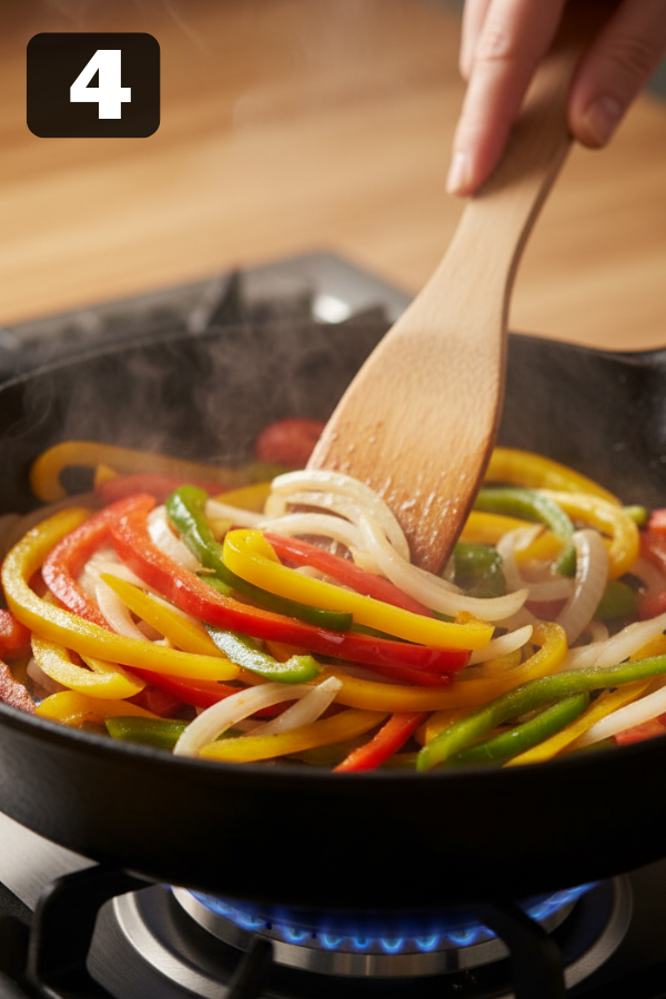 - Sauté The Fajita Veggies In the same pan: Add 1–2 Tbsp oil if the pan looks dry. Toss in the peppers and onions with a pinch of salt. Cook over medium-high for 5–7 minutes, stirring occasionally. You want them slightly softened with a bit of char on some edges. Here’s a small trick: don’t stir too much. Let the veggies sit for 30–40 seconds between stirs so they can colour instead of just steaming.