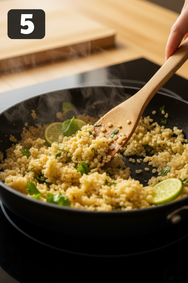 - Cook for 5–7 minutes, breaking up clumps, until the rice is hot and just slightly toasted.