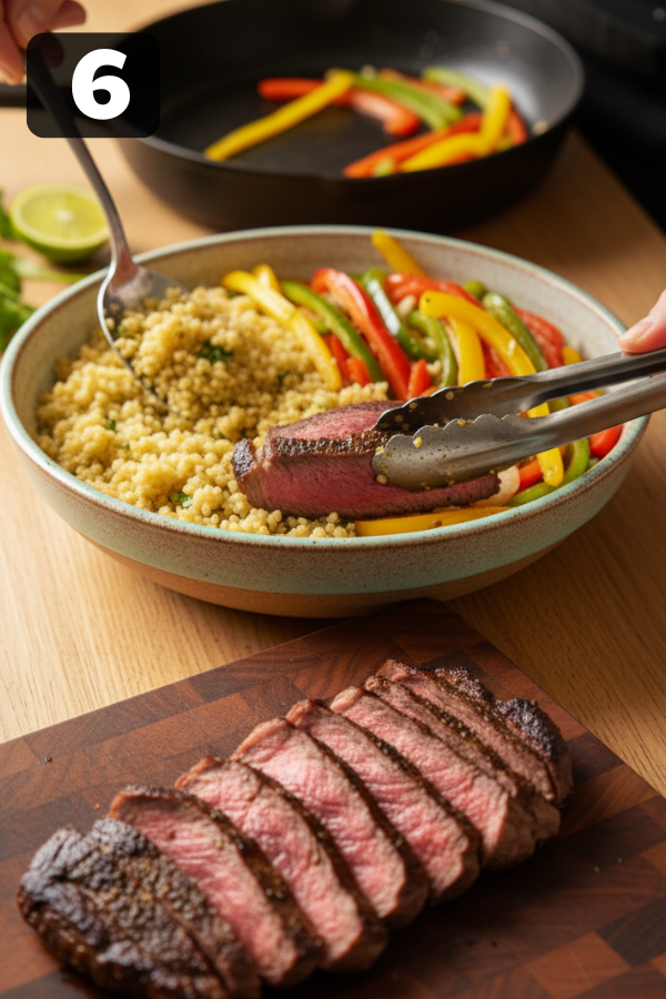 Here’s the flow busy cooks care about: marinate → sear steak → cook veggies + base → assemble.